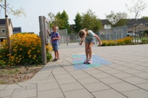 Een manier om dit probleem aan te pakken is door lezen te combineren met fysieke activiteiten. Kinderen zitten vaak urenlang stil in de klas, terwijl onderzoek laat zien dat beweging juist kan helpen bij het leren. Een belangrijk onderdeel van het 321Start! les-pakket is het gebruik van het letterbord. Dit is een soort van toetsenbord op de tegels met ernaast een krijtbord op het plein, waarmee kinderen kunnen leren door verschillende spelvormen te doen. Ze kunnen bijvoorbeeld springen van letter naar letter om woorden te vormen of woorden maken die starten met bepaalde klanken. Voor veel kinderen kan deze combinatie van lezen en bewegen een echte motivatieboost geven. Kinderen die moeite hebben om zich te concentreren bij traditioneel leesonderwijs, vinden het vaak makkelijker en leuker om actief bezig te zijn terwijl ze leren. Bovendien biedt de buitenomgeving een verfrissende afwisseling van het klaslokaal, wat bijdraagt aan een positieve leerervaring.