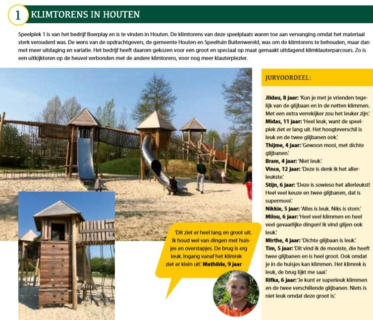 Als winnaar is uiteindelijk door het kidspanel Speeltuin Buitenwereld in Houten gekozen als meest aantrekkelijke en aansprekende speeltuin ontwerp. De kinderen waren het meest enthousiast over dit spannende, veelzijdige en uitdagende klimparcours. Op 5 juni 2019 werd de prijs uitgereikt in de speeltuin door gastredacteur Tim (5). Hij was met name onder de indruk van de grootte van het klimparcours, de klimwand en het feit dat je twee spannende glijbanen onderweg tegenkomt. Ook is Tim natuurlijk kritisch op wat zaken die hij iets minder leuk vindt aan de speeltuin, zo vind hij de brug een beetje saai.