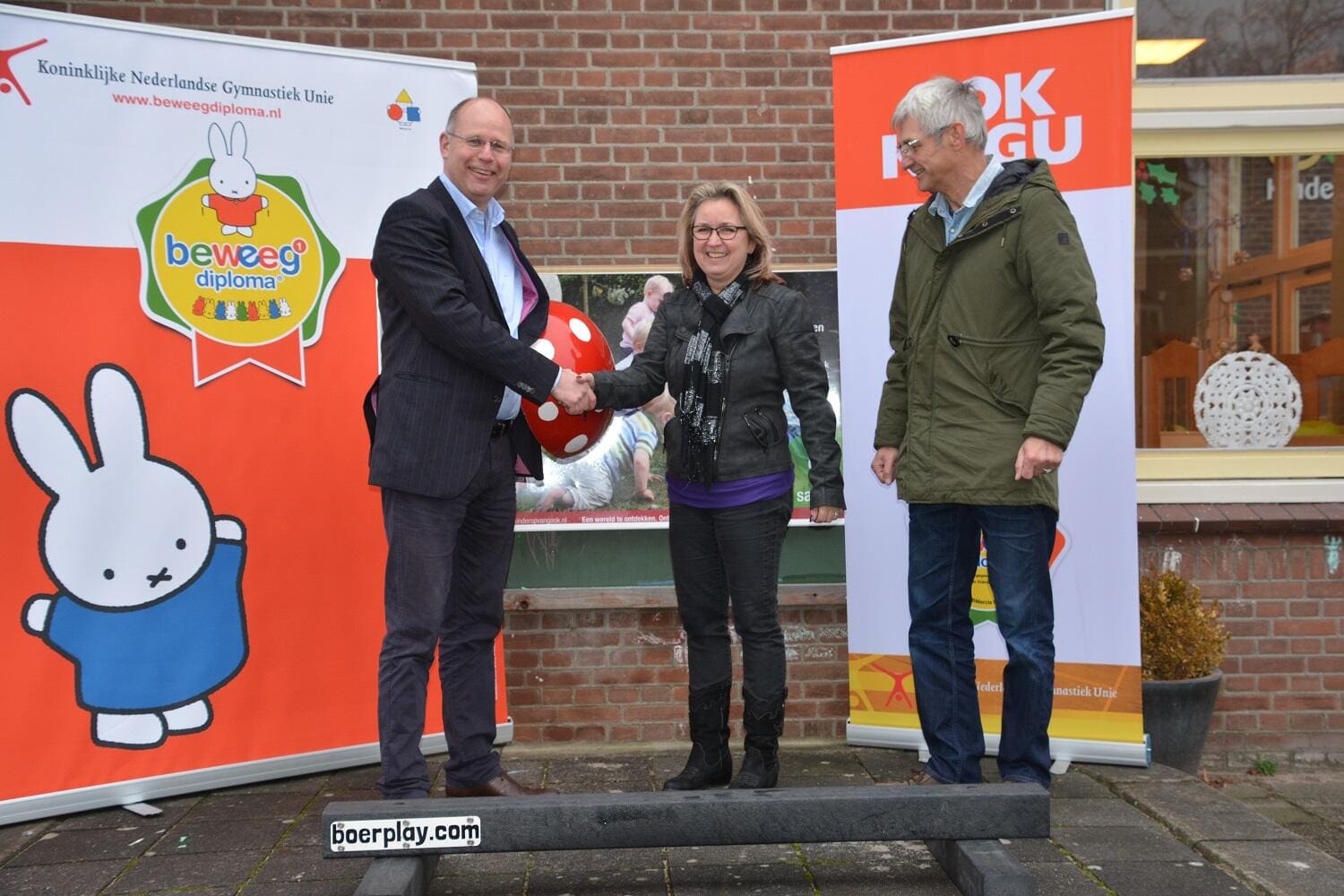 Het is essentieel om op een goede manier te leren bewegen. Om die reden heeft de Koninklijke Nederlandse Gymnastiek Unie (KNGU) samen met nijntje een beweegprogramma speciaal voor peuters en kleuters ontwikkeld: het nijntje Beweegdiploma. Om het beweegprogramma te ondersteunen zijn er speeltoestellen beschikbaar gesteld door BOERplay. Deze toestellen zijn donderdag 15 december feestelijk overhandigd aan het KNGU en meteen door de enthousiaste kinderen van kinderdagverblijf Roezemoes uit Apeldoorn in gebruik genomen.