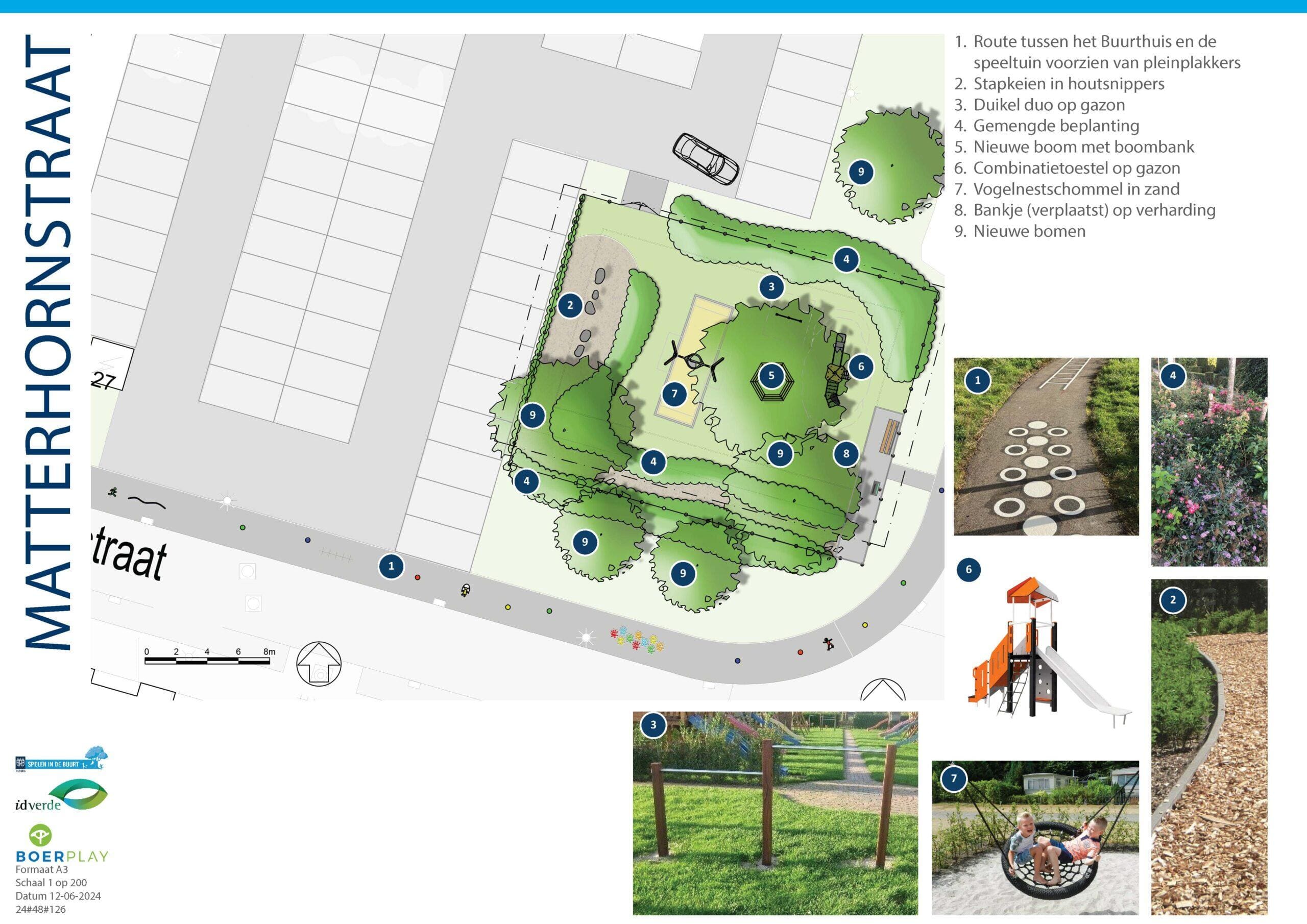 In het ontwerp is de mandschommel toegevoegd omdat schommelen een grote wens is en op deze schommel meerdere kinderen tegelijk kunnen schommelen. Ook klimmen is een grote wens uit de eerste participatie. Daarom een nieuwe klimtoren met een makkelijke trap en een metalen glijbaan. Verder staat er nog een duikelrek en blijft nog ruimte over om zelf leuke dingen te verzinnen.
