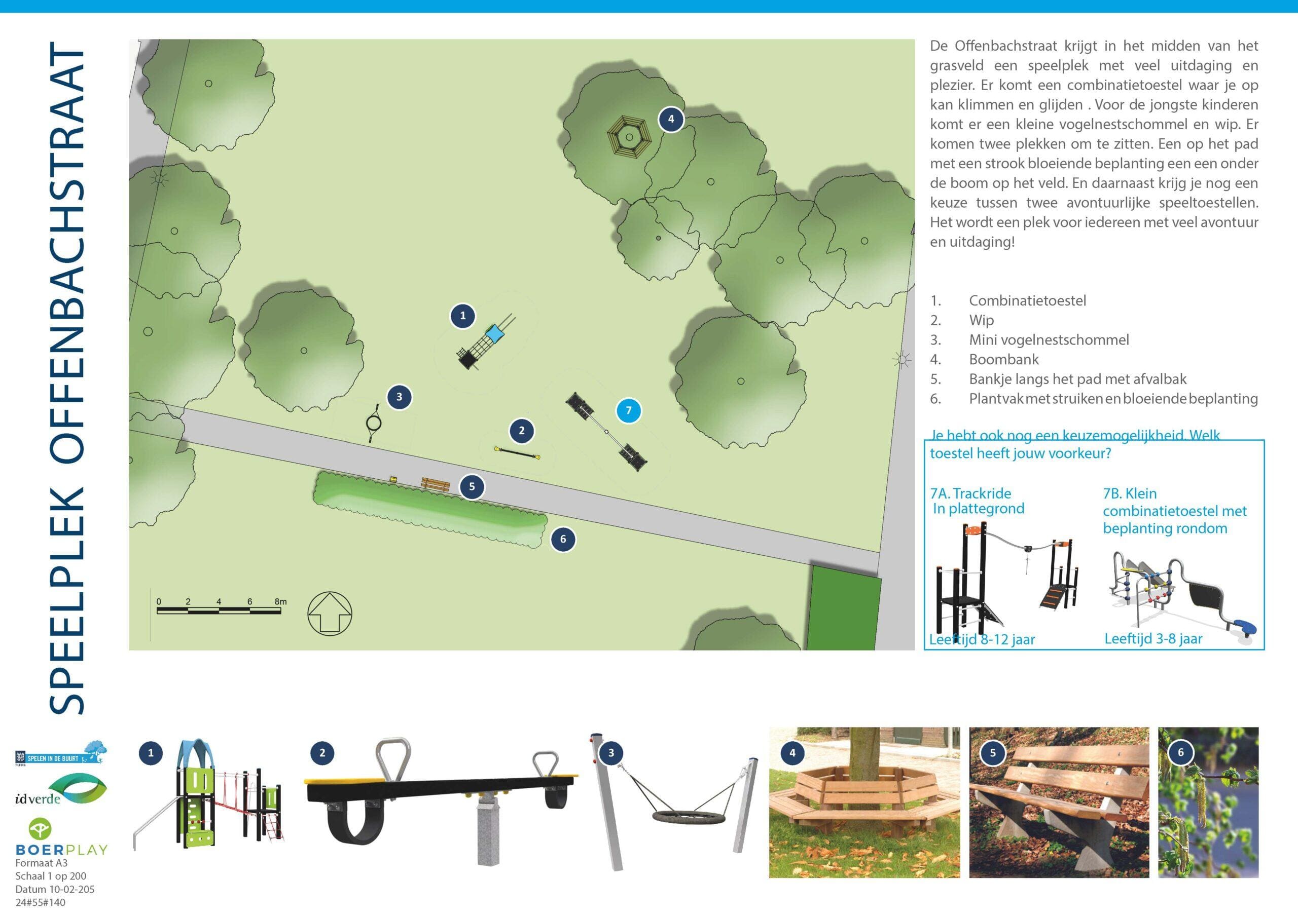 De speelplek aan de Offenbachstraat is de groene verbinding van de omliggende woningen. Het wandelpad in het midden verbindt oost en west. Op dit moment staat er een groot combinatietoestel. Deze gaat inclusief de ondergrond van kunstgras weg.