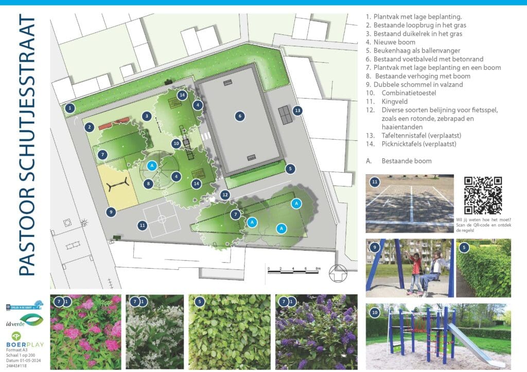 - Er kwam een vraag binnen of er nog een mogelijkheid is om een basketbalpaal te plaatsen. Er is gezocht binnen het ontwerp naar ruimte. Het pannaveld lijkt daarmee de meest geschikte locatie. Maar technisch gezien is het niet haalbaar om hier een paal te plaatsen en voldoende ruimte te bieden om te basketballen met elkaar. Daarom is dit niet opgenomen in het definitieve ontwerp