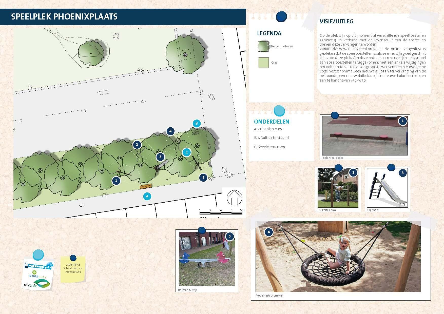 Vanuit de bewonersbijeenkomst en de online vragenlijst is gebleken dat de speeltoestellen zoals ze er nu zijn goed geschikt zijn voor deze plek. Om deze reden is een vergelijkbaar aanbod aan speeltoestellen teruggekomen, met een enkele wijzigingen om ook aan te sluiten op de grootste wensen: Een nieuwe kleine vogelnestschommel, een nieuwe glijbaan ter vervanging van de bestaande, een nieuw duikelduo, een nieuwe balanceerbalk en een te handhaven wip-wap.