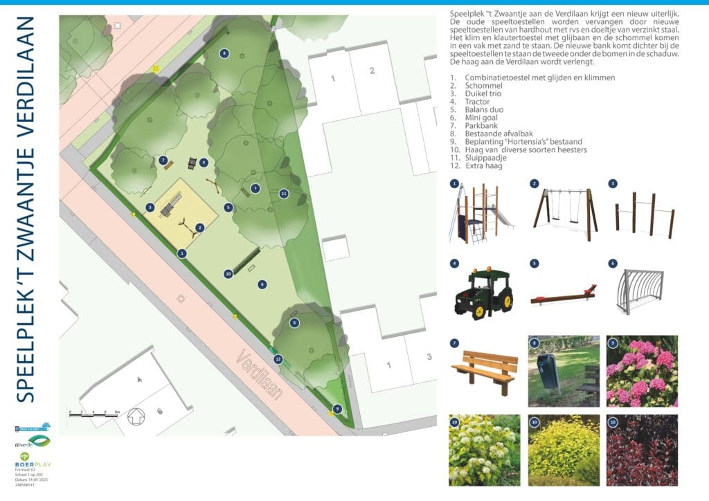 Bewonersbijeenkomst dinsdag 5 november van 15.00 tot 16.30 uur vindt plaats op de speelplek ’t Zwaantje aan de Verdilaan.Vragenlijst is in te vullen tot 13 november 2024.Begin maart 2025 kun je als bewoner het voorlopige ontwerp online inzien en op reageren.Tot 31 maart kun je op de site jouw reactie doorgeven op het Voorlopige ontwerp.Begin mei wordt het definitief ontwerp online geplaatst.- vanaf maandag 7 juli gaat idverde starten met de werkzaamheden en wij verwachten rond donderdag 17 juli gereed te zijn. Het plantseizoen is voorbij daarom worden er geen planten aangebracht. In het najaar van 2025 wordt de beplanting aangebracht.