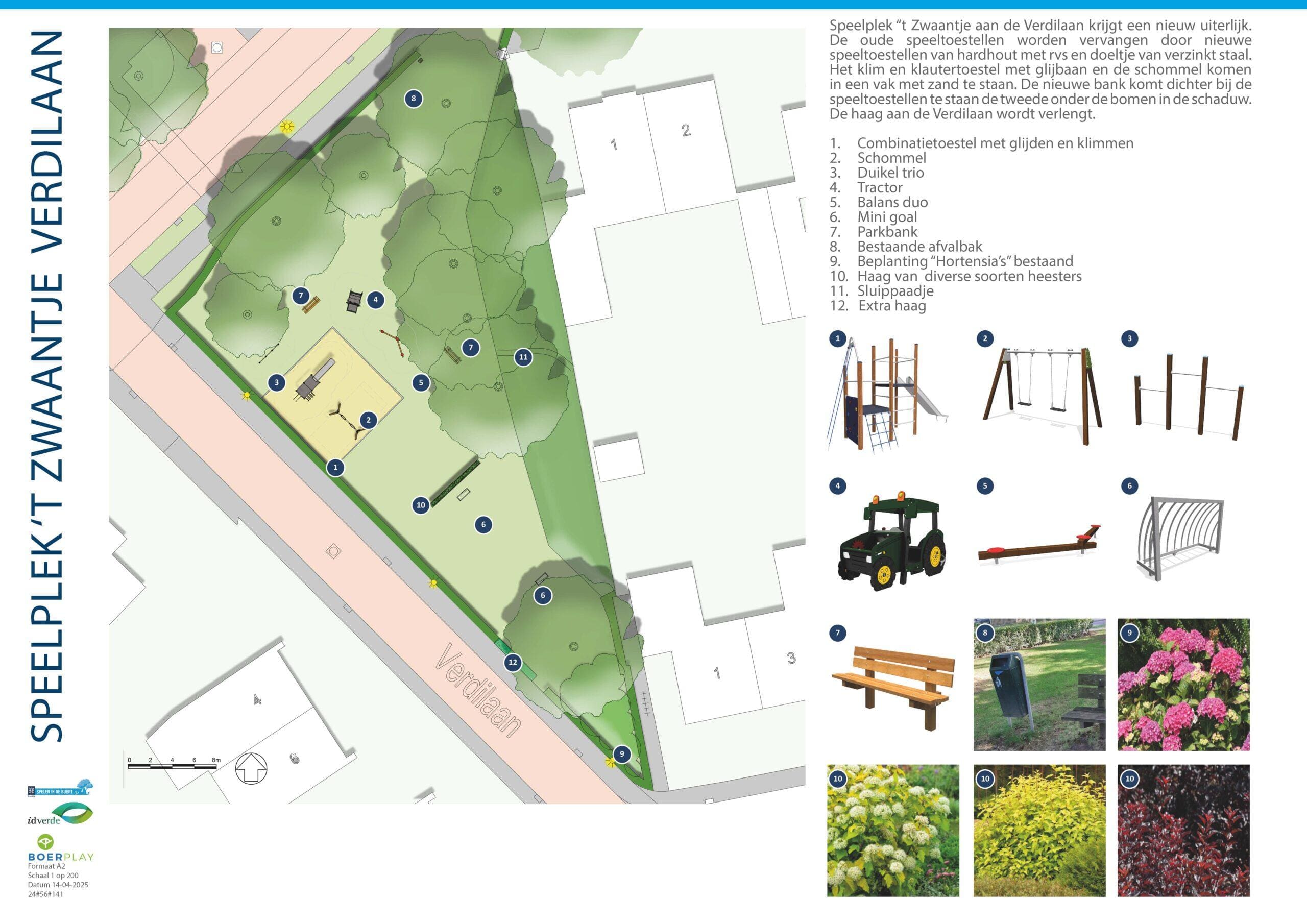 Bewonersbijeenkomst dinsdag 5 november van 15.00 tot 16.30 uur vindt plaats op de speelplek ’t Zwaantje aan de Verdilaan.Vragenlijst is in te vullen tot 13 november 2024.Begin maart 2025 kun je als bewoner het voorlopige ontwerp online inzien en op reageren.Tot 31 maart kun je op de site jouw reactie doorgeven op het Voorlopige ontwerp.Begin mei wordt het definitief ontwerp online geplaatst.- vanaf maandag 7 juli gaat idverde starten met de werkzaamheden en wij verwachten rond donderdag 17 juli gereed te zijn. Het plantseizoen is voorbij daarom worden er geen planten aangebracht. In het najaar van 2025 wordt de beplanting aangebracht.