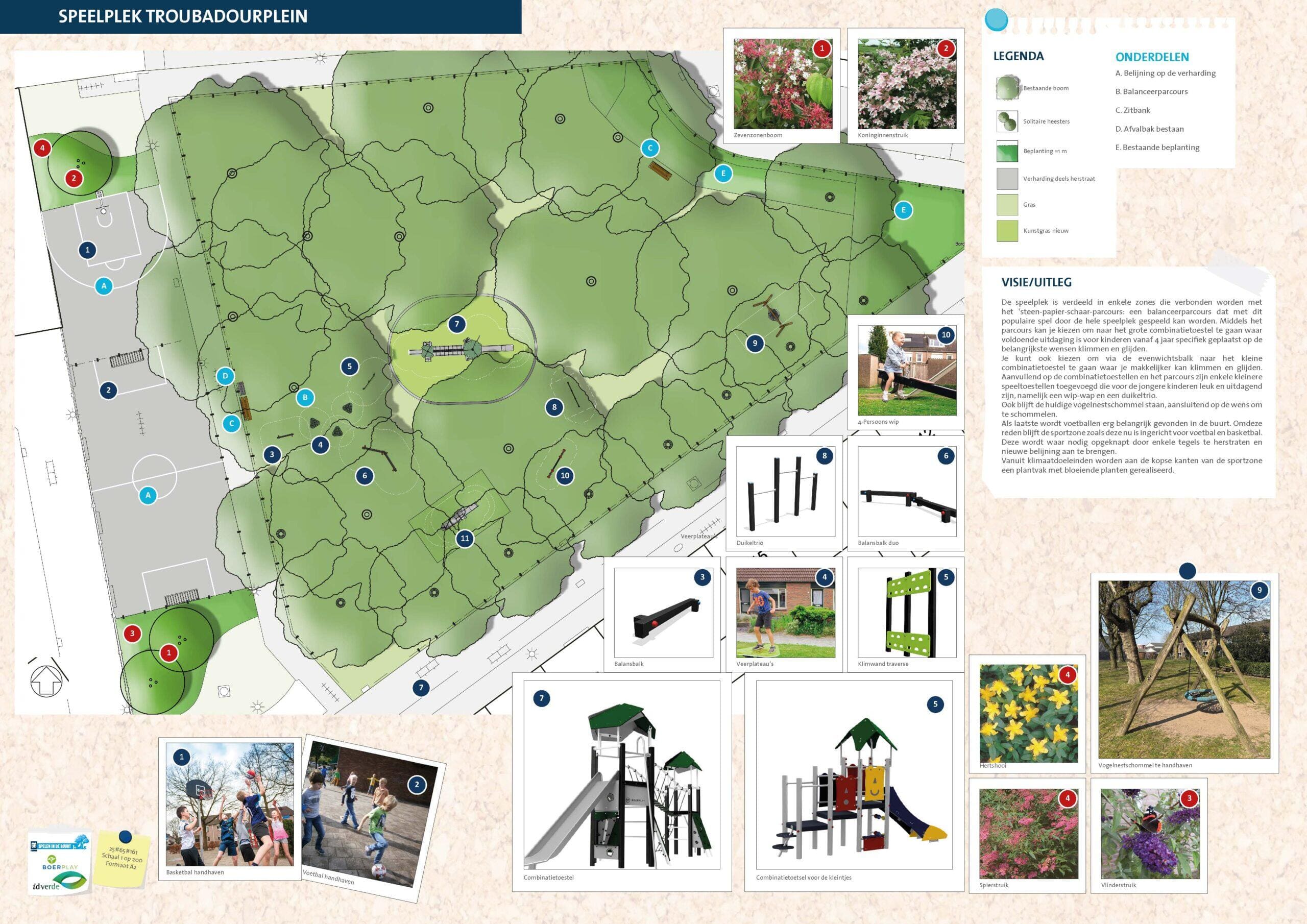De speelplek is verdeeld in enkele zones die verbonden worden met het ‘steen-papier-schaar-parcours’: een balanceerparcours dat met dit populaire spel door de hele speelplek gespeeld kan worden. Middels het parcours kan je kiezen om naar het grote combinatietoestel te gaan waar voldoende uitdaging is voor kinderen vanaf 4 jaar en specifiek geplaatst op de belangrijkste wensen klimmen en glijden. Je kunt ook kiezen om via de evenwichtsbalk naar het kleine combinatietoestel te gaan waar je makkelijker kan klimmen en glijden. Aanvullend op de combinatietoestellen en het parcours zijn enkele kleinere speeltoestellen toegevoegd die voor de jongere kinderen leuk en uitdagend zijn, namelijk een wip-wap en een duikeltrio. Ook blijft de huidige vogelnestschommel staan, aansluitend op de wens om te schommelen. Voetballen is erg belangrijk in de buurt, dit bleek duidelijk uit de vragenlijst. Om deze reden blijft de sportzone zoals deze nu is ingericht voor voetbal en basketbal. Deze wordt waar nodig opgeknapt door enkele tegels te herstraten en nieuwe belijning aan te brengen. Ten behoeve van klimaatdoeleinden worden aan de kopse kanten van de sportzone een plantvak met bloeiende planten gerealiseerd.