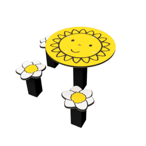 Dieses Picknick-Set mit Tisch Sonne und Stuhl Blume ist auch mit Stuhlmuschel erhältlich.