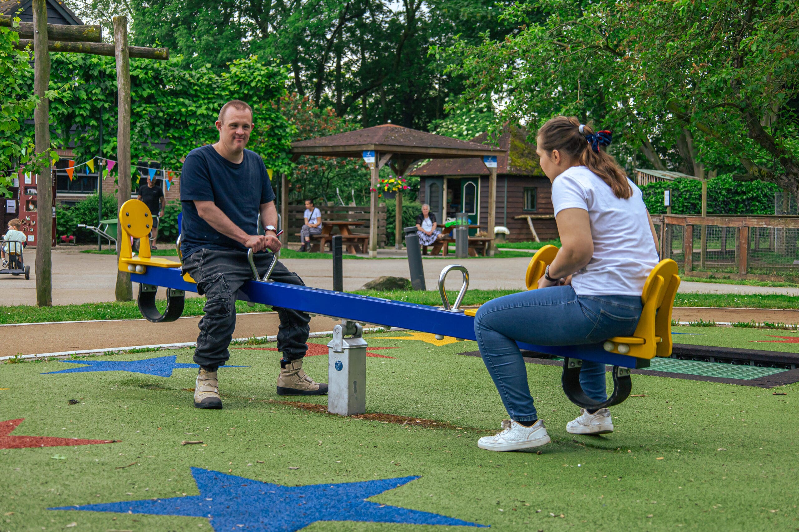 Menschen mit Behinderungen leben an diesem Ort von ASVZ. Jung und Alt, leicht und stark intellektuell eingeschränkt. Für all diese Menschen bietet ASVZ die notwendige Betreuung und Beratung. Und sie spielen im Außenbereich der Pflegeeinrichtung unabhängig oder unter Aufsicht. Wir haben das Design so gestaltet, dass jeder im Merwebolder, mit oder mit einer Behinderung, von jung bis alt, zusammen oder nur im Freien spielen oder bleiben kann. Wir verwenden ein Designkonzept, das speziell auf Pflege und Wohlbefinden ausgerichtet ist: Playing Together, vor allem für inklusives Spiel. Zum Beispiel kann es ausgiebiges Spiel zusammen geben, es gibt Bewegungsgeräte und pädagogische Elemente. Aber Sie können auch im Tiergehege entspannen oder aushelfen. Alles für optimales Spielen, Lernen, Erholung, Bewegung und Zusammengehörigkeit.