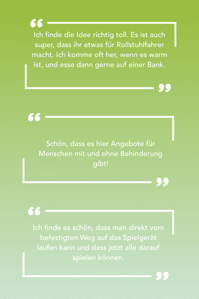 „Wir nennen es inklusiv, aber eigentlich ist ›gemeinsam spielen‹ der treffendere Begriff. Das Gerät hat beidseitig einen rampenartigen Zugang mit geringer Steigung. So können Kinder im Rollstuhl einfach nach oben. Oben angekommen, kommen alle Kinder zusammen, um zu spielen. Und auf dem Weg nach oben gibt es allerlei zu entdecken. Seitlich befinden sich Spieltafeln, mit denen Kinder durch Tasten und Hören erkunden können. Für sehbehinderte Kinder ist das eine wirkliche Bereicherung des Spielvergnügens.“
