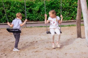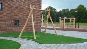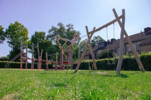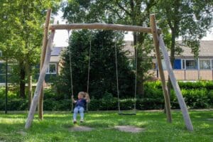 The height of lying beam of this double swing is 2.5 metres. The swing is equipped with 2 equal swing seats that allow children from about 4 years of age to swing. BOERplay has different types of swings with different types of swing seats and in different types of durable materials.