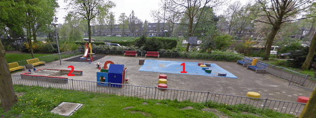 - Afgeschreven peuterspeelplek voor de doelgroep 0 – 4 jarigen op een verhard plein (zie 2 op onderstaande afbeelding).