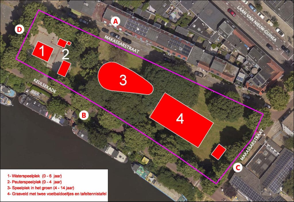 - Wij gaan de waterspeelplek (0 – 6 jaar), de peuterspeelplek (0 – 4 jaar) en de speelplek (4 – 14 jaar) aan de Makassarstraat opnieuw inrichten.