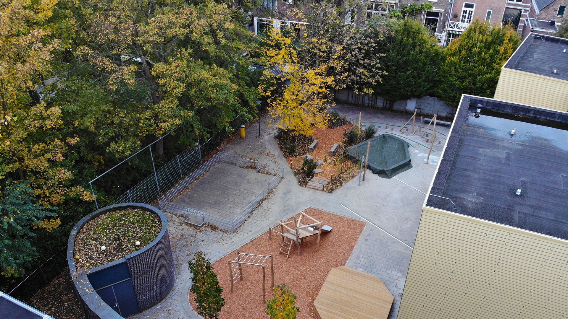Met de nieuwe schoolplein inrichting zijn veel betontegels verwijderd en stuitte men op een niet drainerende ondergrond. Door het uitgraven hiervan verwacht de projectgroep dat het regenwater voortaan beter zijn weg naar beneden kan vinden. Ook zijn er extra bomen bijgeplaatst en is er voor de bestaande bomen ruimte gemaakt om deze beter te laten groeien en water op te laten nemen. Als extra toevoeging is er een regenton geplaatst op het schoolplein zodat het regenwater gebruikt kan worden om planten water te geven én kan er door de kinderen heerlijk gekliederd worden op het plein met zand en water. Tevens zal er in de nieuwe moestuin en bloemen-en bijentuin gewerkt kunnen worden.