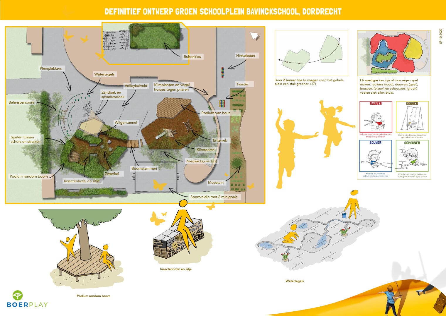Na een goede voorbereiding zijn de kinderen van de Dr. H. Bavinckschool in Dordrecht verblijd met een groenblauw schoolplein. Het voormalige schoolplein met enkele speeltoestellen bood niet voldoende uitdaging voor de kinderen. Waar voorheen veel tegels lagen, is nu plaats gemaakt voor biodiverse beplanting, een insectenhotel, opvang van regenwater en is er veel ruimte voor avontuurlijk spelen ontstaan voor de kinderen van alle leeftijden. Een plein waar je kunt klimmen, balanceren, spelen met zand en water en waar je kunt verstoppen en chillen. Een schoolpleinproject is veel meer dan alleen het vervangen van speeltoestellen.