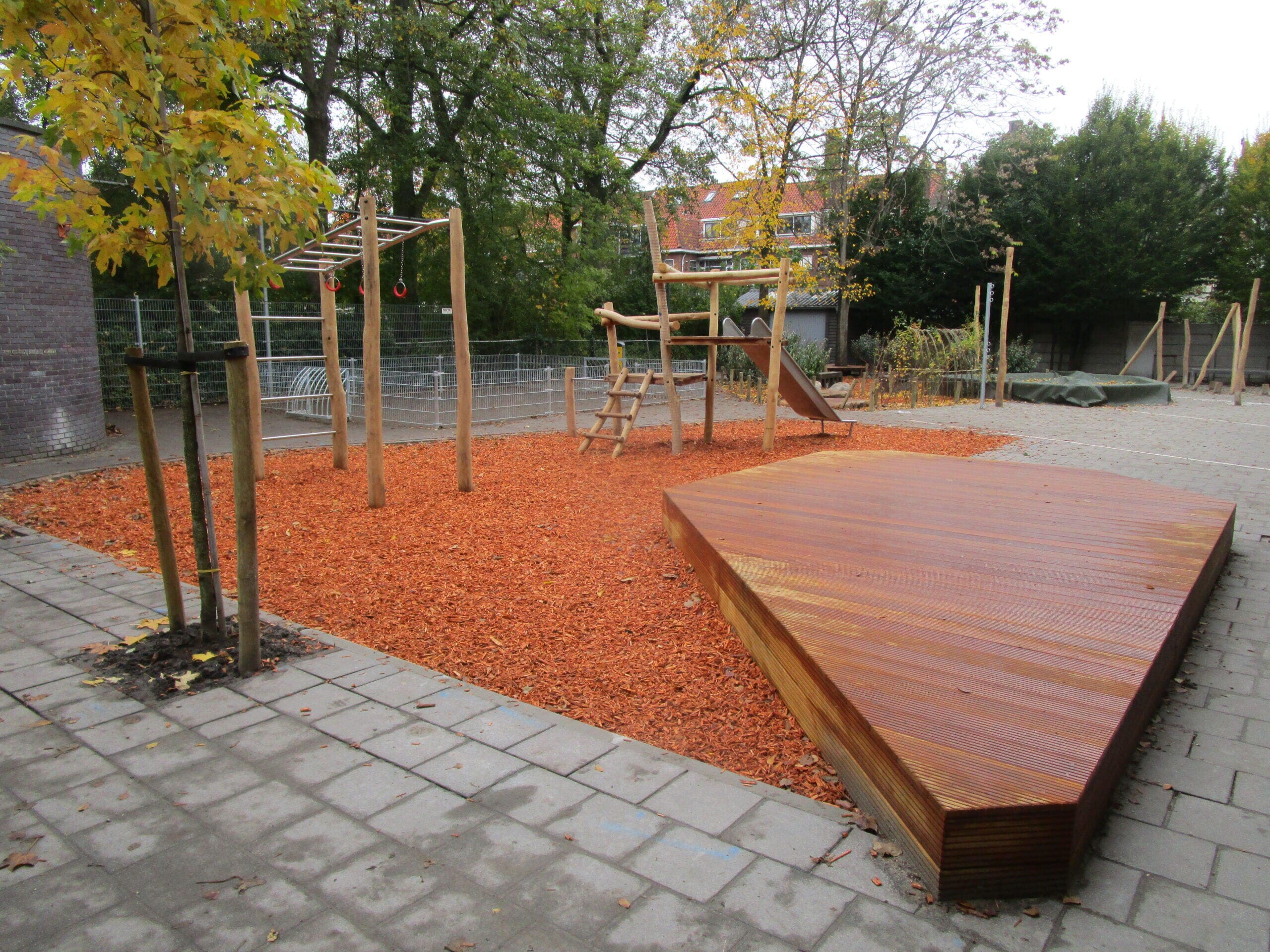 Voor dit schoolplein hebben wij het natuurlijk en avontuurlijk speelontwerp mogen realiseren. Met o.a. speeltoestellen uit het Adventure Play assortiment, een wilgenpad, watertegels, pleinplakkers, struinpaadjes, beplanting en hardhouten materialen voor de vlonders, boombank en het buitenpodium. Ook benieuwd naar de mogelijkheden van een groenblauw schoolplein voor jullie school? Neem contact met ons op voor een vrijblijvende pleincheck en advies.