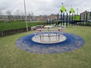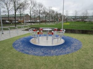 Let op! De ondergrond rondom de rolstoeldraaimolen moet vlak zijn (zonder afschot of bolling) om een drempelloze overgang van omgeving naar de draaimolen te kunnen realiseren.