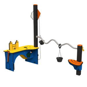Dit speeltoestel bevat een zandzeef, zandglijbaan, beweegstang met luchtbellen en een tafel om aan te spelen.