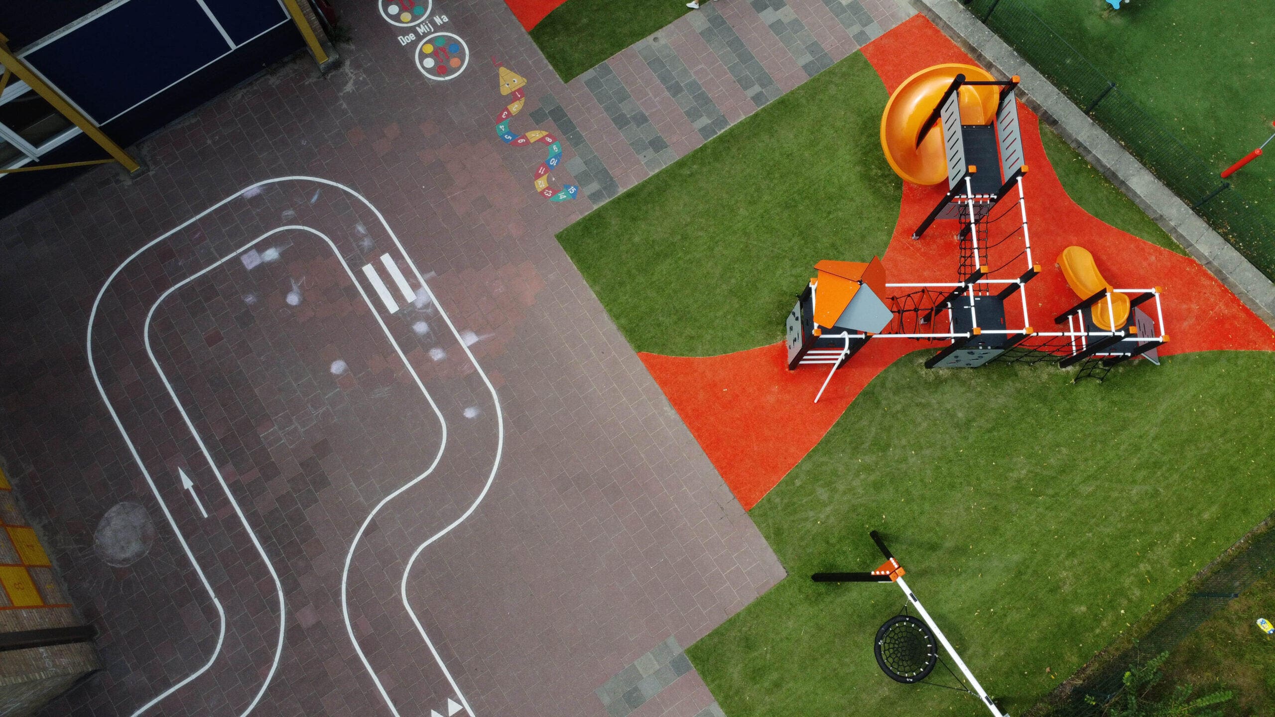 Aan de achterkant van het schoolplein hebben we een parcours gemaakt met een verkeersplein, stopborden, verkeerslichten etc. De drempel die oorspronkelijk het plein in twee delen splitste hebben we weggehaald, om zo meer eenheid te creëren en ervoor de zorgen dat het één groot plein is waar alle kinderen kunnen spelen. Aan de oorspronkelijke voorkant van het plein is gekozen om meer sport en spel te faciliteren, waarbij er ook een zitkring is geplaatst voor de kinderen om te ontspannen of te kijken naar de sportende en spelende kinderen. Verder staat er een pingpongtafel en twee voetbalveldjes, één met grote doeltjes en één met kleine doeltjes.”