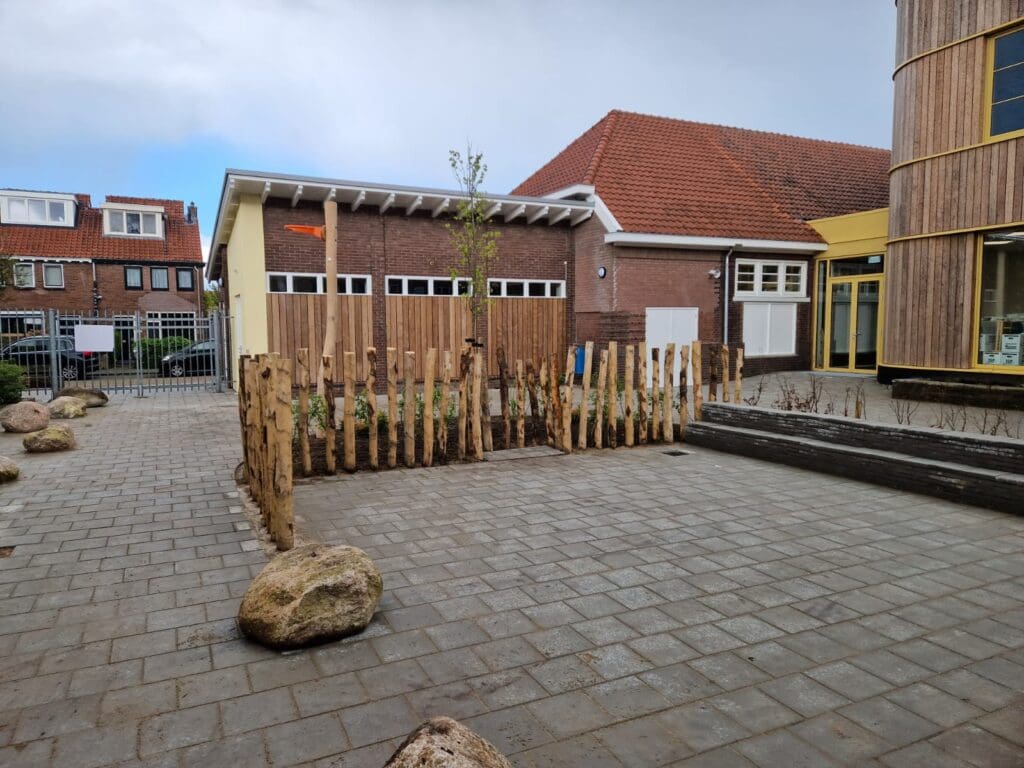 Door het toevoegen van beplanting aan de randen van het schoolplein ontstaat wordt het zicht onttrokken aan de muur die rondom het schoolplein staat. We hebben gekozen voor een weloverwogen mix van inheemse beplanting en andere beplanting die goed in het Nederlandse klimaat past, hiermee bevorderen we klimaatadaptatie en de biodiversiteit.