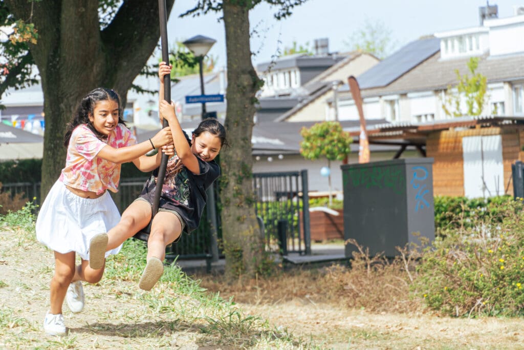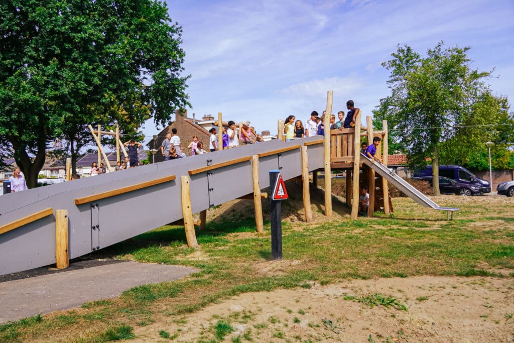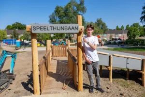 De opdrachtgever, Gemeente Eindhoven, heeft inclusiviteit hoog in het vaandel staan. Daarom moest het een plek worden waar kinderen met en zonder beperking samen kunnen spelen. In 2020 bedacht de toen negenjarige Thijn uit Eindhoven voor een schoolopdracht een rolstoelglijbaan, waarmee kinderen in een rolstoel zelfstandig van een glijbaan kunnen. Zijn idee kreeg veel lof en haalde zelfs de landelijke media. De realisatie liet nog even op zich wachten, maar toen de speelplek aan de Bolomeystraat vernieuwd werd en werd omgevormd tot een inclusieve speelplek, was dit de uitgelezen kans om Thijns droom werkelijkheid te maken. Toen Lucas Rijnders, manager ontwerp en ontwikkeling bij BOERplay, hoorde van Thijns idee, zag hij direct een kans. Waar veel fabrikanten het niet aandurfden omwille van veiligheidsproblemen, zag hij juist een uitdaging. “Ik houd van uitdagingen,” zei hij. “Dit kunnen we maken.” Lucas gaf zijn eigen draai aan het ontwerp, in goed overleg natuurlijk. Thijn kwam samen met zijn ouders bij ons langs om het ontwerp goed te keuren. “Thijn was super enthousiast over het ontwerp,” vertelt Lucas. Om de glijbaan écht inclusief te maken, voegde Lucas ook een ‘gewone’ glijbaan toe. Want als alleen rolstoelgebruikers ervan kunnen glijden, is het volgens hem . “Het was mijn uitdaging om het rolstoeldeel het leukste onderdeel van het speeltoestel te maken. Zó leuk dat andere kinderen gaan vragen of ze de rolstoel mogen lenen, zodat ze er ook vanaf kunnen. Dat is volgens mij gelukt.” De rolstoelgijbaan alleen maakt natuurlijk nog geen speelplek. Daarvoor hebben we bij BOERplay een team met landschapsontwerpers die ervoor zorgen dat de speelplek er mooi uitziet en het voor ieder kind een fijne plek is. Aan dit project werkte onze landschapsontwerper Sara van Mourik. “Voor mij als ontwerper was het een mooie uitdaging om de Speelthijnbaan landschappelijk in te passen in de Bolomeystraat in Eindhoven. Omdat kinderen zelfstandig de glijbaan om moeten rijden moest ik rekening houden met het hellingspercentage van de toerit naar de glijbaan. Dat betekende een langere hellingbaan met rustplateaus, die we op een natuurlijke manier hebben geïntegreerd in de omgeving. Omdat er al een verhoging in het pad nodig was, konden we die meteen combineren met de start van de kabelbaan. Bij het uiteinde van de glijgoot wilde ik extra speelwaarde creëren. In combinatie met het verkeersplein zorgt dat ervoor dat de speelplek echt inclusief is en voor ieder kind iets te bieden heeft. De rest van de speeltuin hebben we aangekleed met een mix van nieuwe en bestaande speeltoestellen, zodat het weer één geheel vormt. Daarbij hebben we gewerkt volgens het 100/70/50-principe voor toegankelijke speelplekken. Tot slot hebben we een wadi toegevoegd om het waterprobleem in de speeltuin op te lossen.” De nieuwe speelplek is uitgegroeid tot een kleurrijk, speels landschap waarin uitdaging, fantasie en toegankelijkheid samenkomen. Naast de rolstoelglijbaan is er een verkeersplein waar iedereen kan meedoen. In een rolstoel, op een fiets of gewoon te voet. Verder vind je er spiderstones over het water, een stoere ROCKS-combinatie, schommels, een inclusieve vogelnestschommel, een nijntje-zandtoestel dat rolstoeltoegankelijk is en een kabelbaan voor extra snelheid en spanning. Sander: “We hebben goed gekeken naar de balans tussen avontuur en toegankelijkheid. Niet elk toestel hoeft per se rolstoeltoegankelijk te zijn, als het geheel maar zorgt dat ieder kind zijn eigen manier van spelen vindt.” Ook duurzaamheid kreeg aandacht. “Een aantal toestellen die nog in goede staat waren, hebben we hergebruikt,” vertelt Sander. Ook is er onderzocht of er kinderen met een handicap in de buurt wonen en hoe daar rekening mee gehouden kan worden. Op basis van deze informatie konden we bij BOERplay aan de slag met het ontwerp van de speelplek. De opening van de speelplek was een bijzonder moment. Na vijf jaar mocht Thijn dan eindelijk zijn eigen Thijnspeelbaan openen. En wel in stijl: hij ging er zelf met zijn rolstoel vanaf. Nadat Thijn de plek officieel had geopend, namen de kinderen van de naastgelegen basisschool het speelterrein enthousiast in gebruik. De rolstoelglijbaan bleek in het begin nog best spannend, maar naarmate de dag vorderde durfden steeds meer kinderen naar beneden te glijden. “Dat de rolstoelglijbaan in het begin een beetje spannend is, is juist goed,” vertelt Sander. “Voor alle kinderen is van een hoge glijbaan glijden de eerste keer spannend. Als het niet uitdagend is, is het ook niet leuk.” De opening trok veel media-aandacht. Lokale en landelijke media, waaronder het Jeugdjournaal, Trouw, het Eindhovens Dagblad en het Brabants Dagblad, waren aanwezig om het feestelijke moment vast te leggen. De Thijnspeelbaan is daarmee een bijzondere speelplek geworden voor de buurt en een inspirerend voorbeeld van inclusief ontwerpen. Een plek waar elk kind, met of zonder beperking, samen kan spelen, ontdekken en plezier maken.Een speelplek voor iedereen