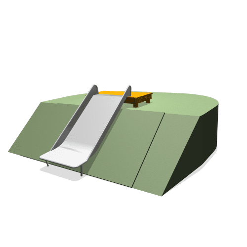 Glijbaan: deze extra brede glijbaan is geschikt om samen vanaf te glijden. Dit kan met een begeleider, maar natuurlijk ook met een vriendje of vriendinnetje. De glijbaan is geplaatst op een licht hellend talud, waardoor kinderen er gemakkelijk naar toe kunnen klimmen. Voor extra ondersteuning is er een hellingklimmer begeleid met een touw voor extra stabiliteit.